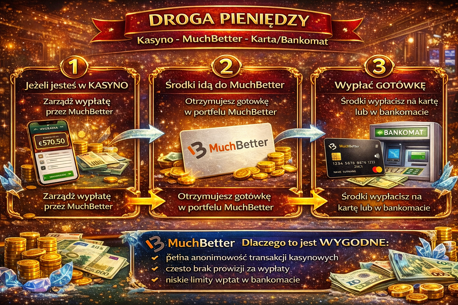 💡 Czy wiesz, że? Środki wypłacone z kasyna na konto MuchBetter są dostępne do zakupów w sklepach stacjonarnych i online natychmiast po zaksięgowaniu — bez konieczności transferu na konto bankowe. Karta MuchBetter Mastercard działa wszędzie tam, gdzie akceptowany jest Mastercard, w tym w polskich bankomatach i terminalach płatniczych.